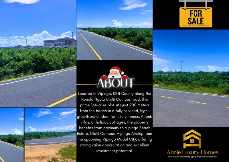 1/4-ACRE PLOT, Vipingo, Kilifi County Nestled in one of Vipingo’s most coveted and rapidly appreciating locations, this 1/4-acre plot presents a rare opportunity for discerning investors and homeowners. Situated along the prestigious Ronald Ngala Utalii Campus road and only 200 meters from the beach, this plot enjoys premium positioning within a serene and secure neighborhood. With direct frontage to the beach access road, this property guarantees unmatched convenience and accessibility for residential or hospitality development. All horizontal infrastructure is fully in place, including graded roads, drainage, water, and power – ready for immediate development. KEY HIGHLIGHTS: • Location: Vipingo, Kilifi County - along the Ronald Ngala Utalii Campus road. • Proximity to Beach: Only 200 meters from the beach. • Plot Size: 1/4 acre (approx. 100 x 100 ft) . • Infrastructure: Fully serviced with electricity, water and access roads. • Ideal For: Luxury residential homes, Airbnb villas, vacation cottages or a beachside investment property. • High Growth Zone: Within the vicinity of Vipingo Beach Estate, Utalii Campus and the upcoming Vipingo Model City. WHY INVEST HERE? • Prime location in a high-end, well-planned estate environment. • Walking distance to the coastline and emerging tourism hotspots. • Close to VIPINGO AIRSTRIP and just a short drive from SGR Mombasa Terminus. • Exceptional value appreciation potential driven by infrastructure and institutional developments. PRICE: • KES 6.5 Million • Approx. USD 50,305.70 (based on current exchange rate) CONTACT US: For inquiries or to schedule a site visit: Annie Luxury Homes +254 743 260 826 +254 791 483 787